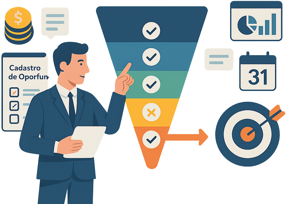 Cadastro completo de oportunidades e produtos/serviços com valores de venda.